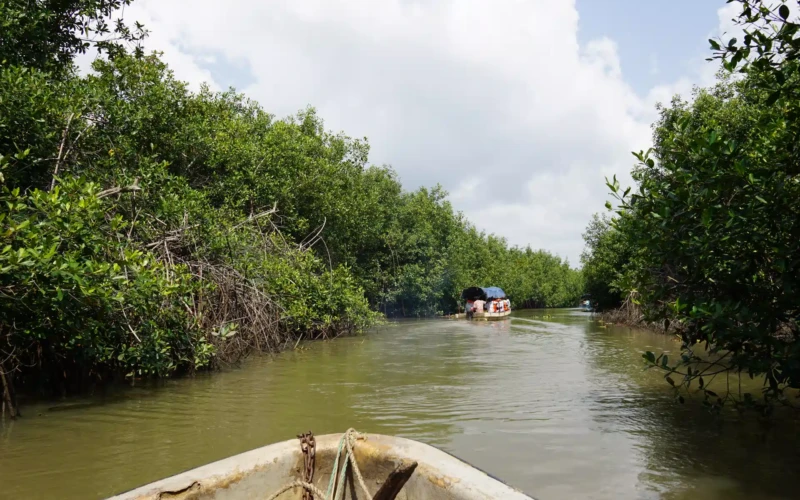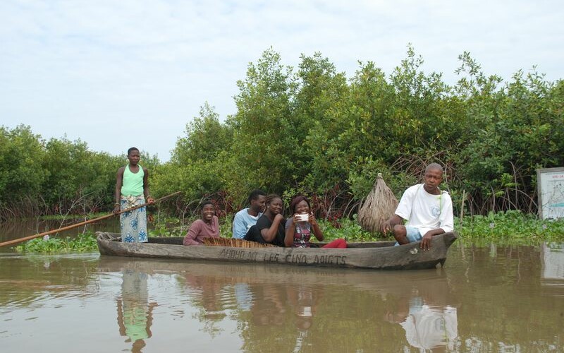 Départ en barque motorisée pour la découverte de la réserve de Biosphère Mono MAB UNESCO dans son site fluvio-marin la Bouche du Roy, nous participons aux activités socio-économiques des femmes de la réserve comme la préparation de toffi, un caramel à base du lait de coco ; préparation d’huile de coco, du sel traditionnel et bien d’autres.